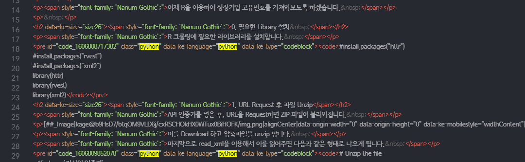 그럼 아래와 같이 <pre id = "code_ .... > 안에 class, 그리고 data-ke-language 가 python으로 되어 있는 것을 알 수 있습니다!