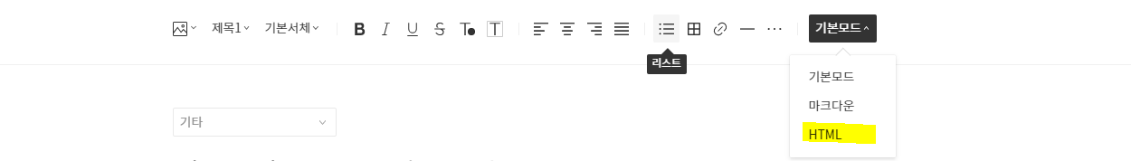 1. 작성 중인 파일에 들어가 기본모드 -> HTML 모드로 전환