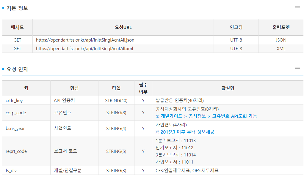 바꾼 요청인자와 원래 요청인자를 모두 넣고, 다음 함수를 실행하면 단일기업이 전체 재무제표를 볼 수 있습니다.
