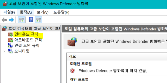 1) 제어판 → Windows 방화벽 → 왼쪽의 "고급 설정" 클릭