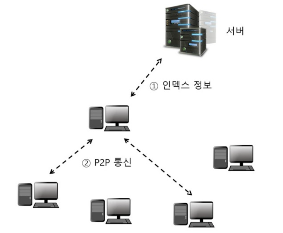 - 각 노드가 보유한 데이터의 정보가 인덱스 서버에 기록. 노드는 자신이 요구하는 데이터의 소유자를 인덱스 서버에 질의하고 해당 데이터를 가진 노드 정보를 받고 직접 노드에 연결해 데이터를 교환. 노드가 데이터를 주고 받는 형식은 P2P 형태, 인덱스 서버 요청은 클라이언트 서버형 시스템의 형태
