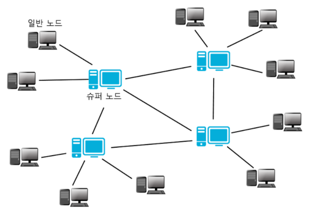 - 일반 노드보다 상위 노드를 만드는 것. 슈퍼 노드는 다수의 일반 노드를 자기 밑에 놓고 메세지의 전파는 슈퍼 노드낄 구축된 네트워크에서 이루어짐.