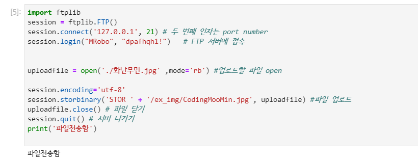 session.storbinary('STOR ' + '/img/CodingMooMin.jpg', uploadfile) #파일 업로드