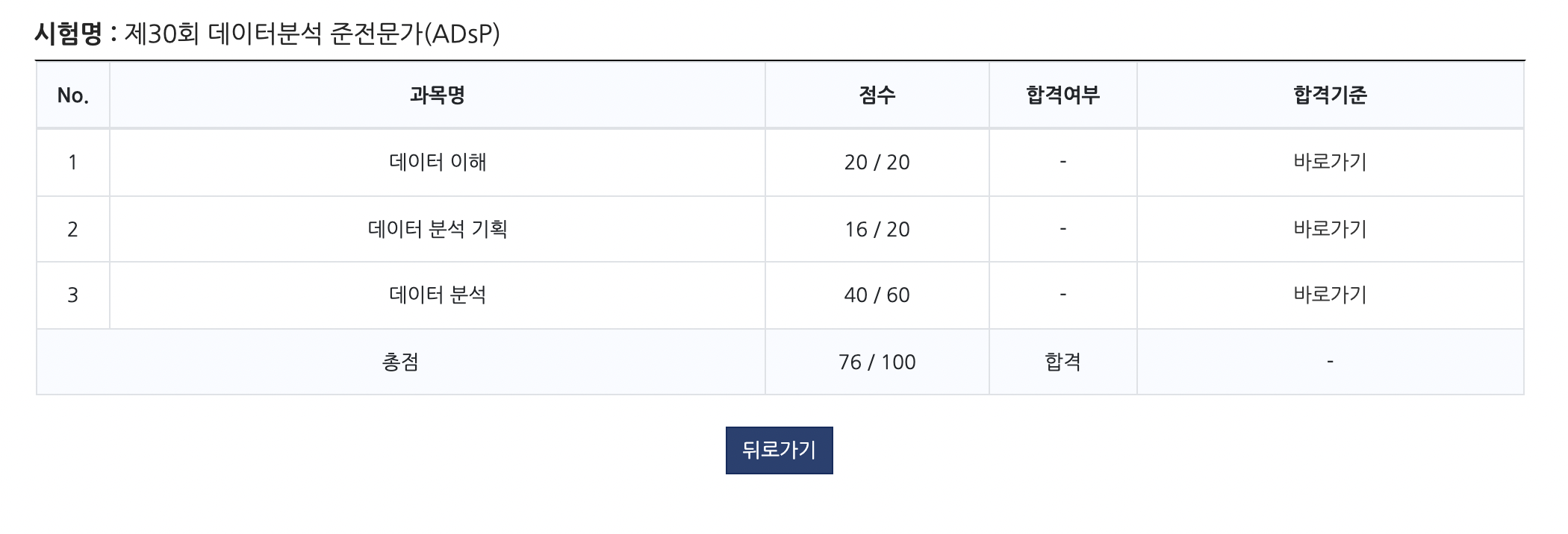 | 합격 기준 | 총 60점 이상 (30문제 이상) | |