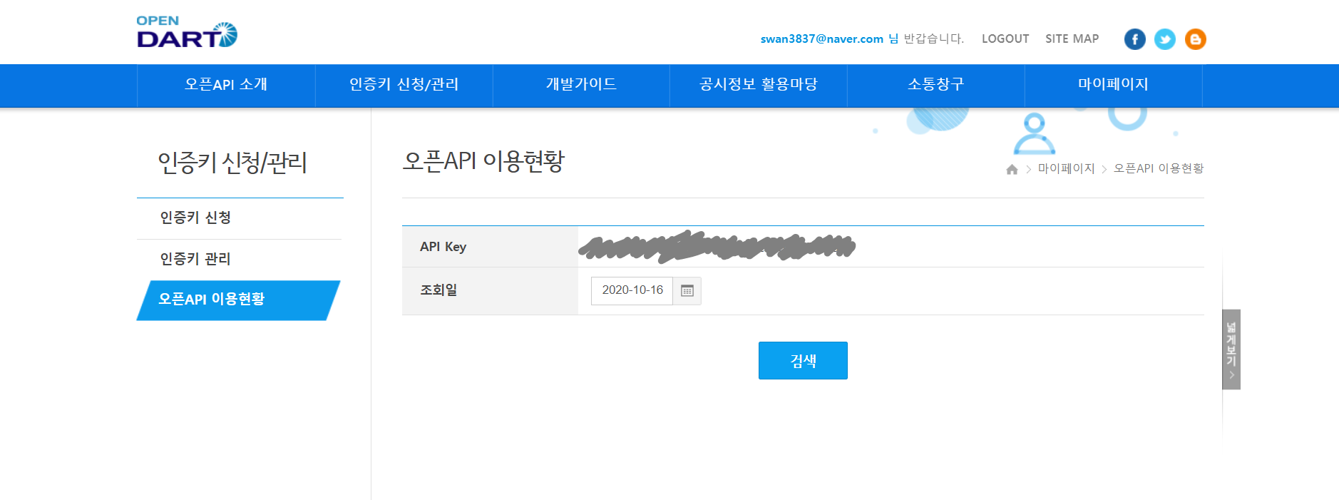 3) "인증키 신청/관리 > 오픈 API 이용현황"에서 API key를 가지고 옵니다