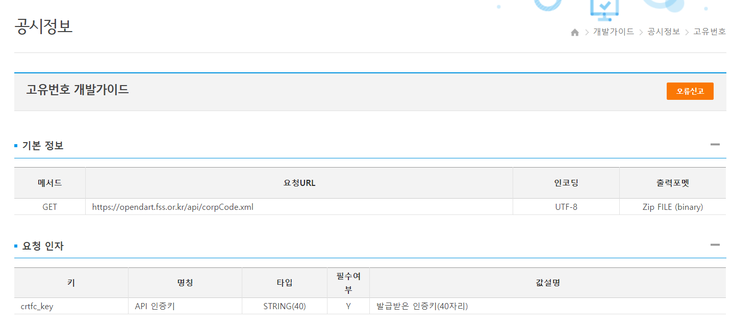 고유번호 크롤링 방법은 "오픈DART > 개발가이드 > 공시정보 목록> 고유번호"를 보면 확인하실 수 있습니다.