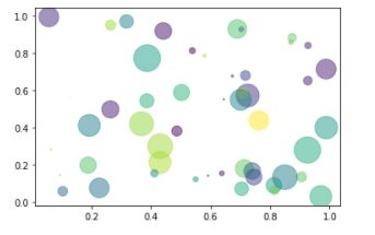 아래 코드는 랜덤하게 50개의 0~1사이의 x, y 그리고 색상, 면접을 뽑고 이를 산점도로 그린것 입니다.