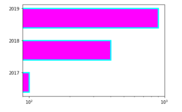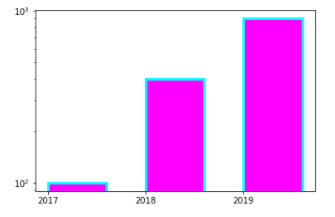 edgecolor="aqua", linewidth=3, tick_label=years, log=True)